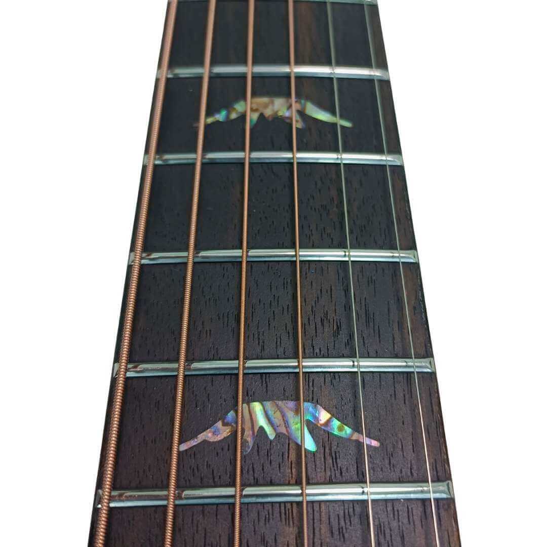 さらに、指板には上品なアマラエボニー、ポジションマークには輝くアバロンのインレイをあしらい、細部までこだわり抜いたデザイン。
