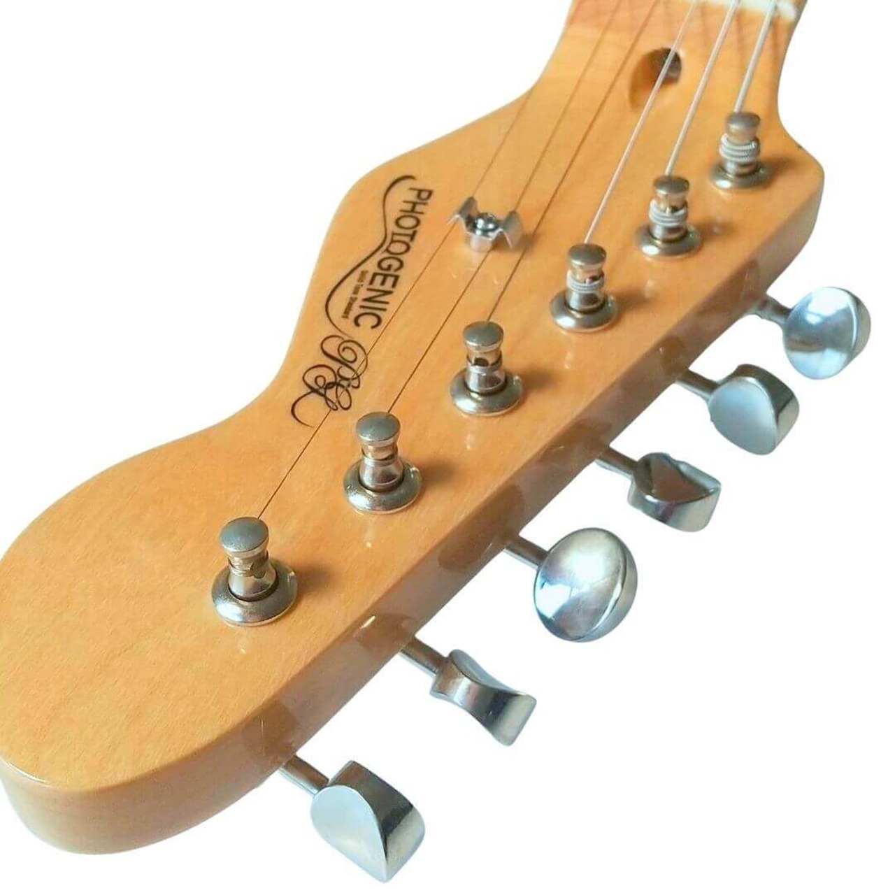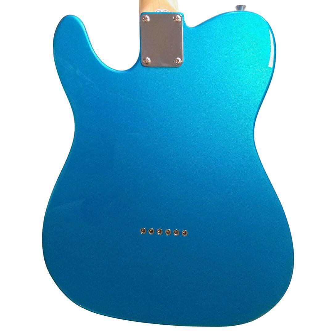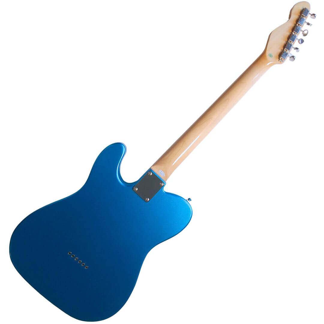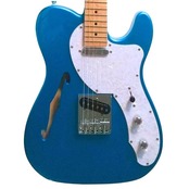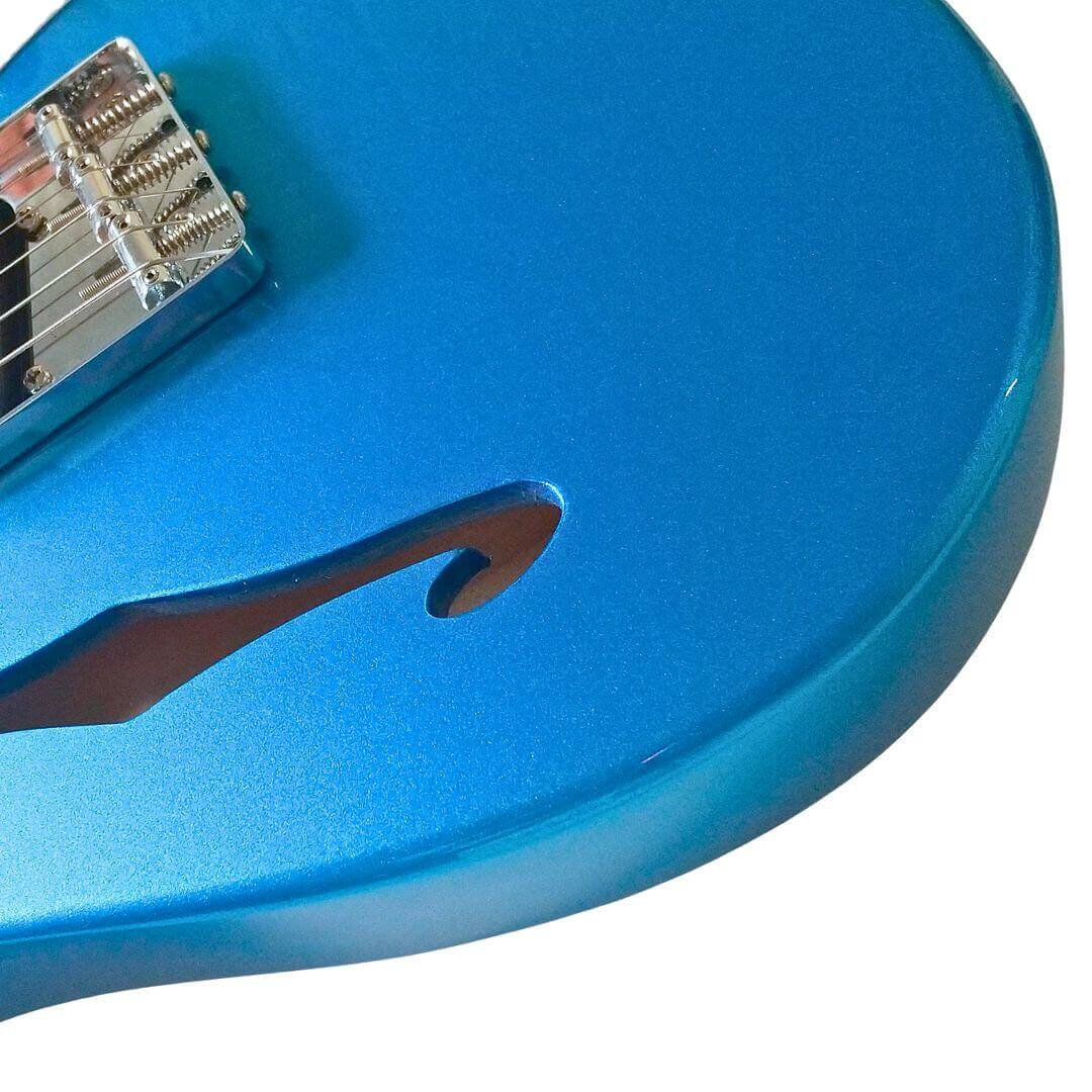見た目でまず惹かれるやつです。爽やかなブルーに、きらっと映えるパール系ピックガード、そしてシンラインらしいFホール。王道のTLスタイルにちょい洒落た雰囲気が足されてて、部屋に置いてても絵になります。