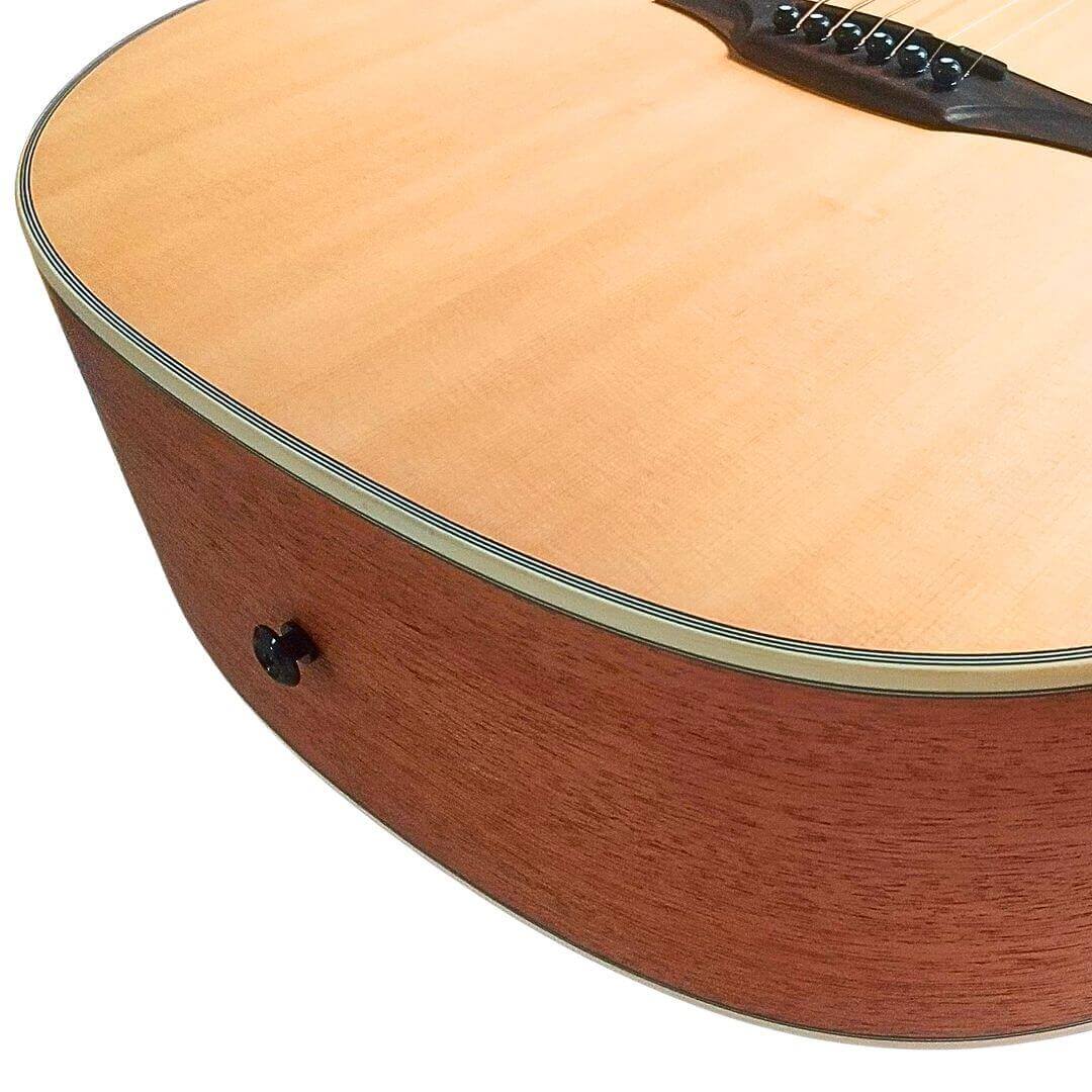 トップはスプルース、サイド&バックはマホガニーの定番コンビ。明るさとあたたかさのバランスが良くて、弾き語りにもコード練習にも相性◎。さらに指板はAmara Ebonyで、見た目も締まるし弾き心地もスムーズです。