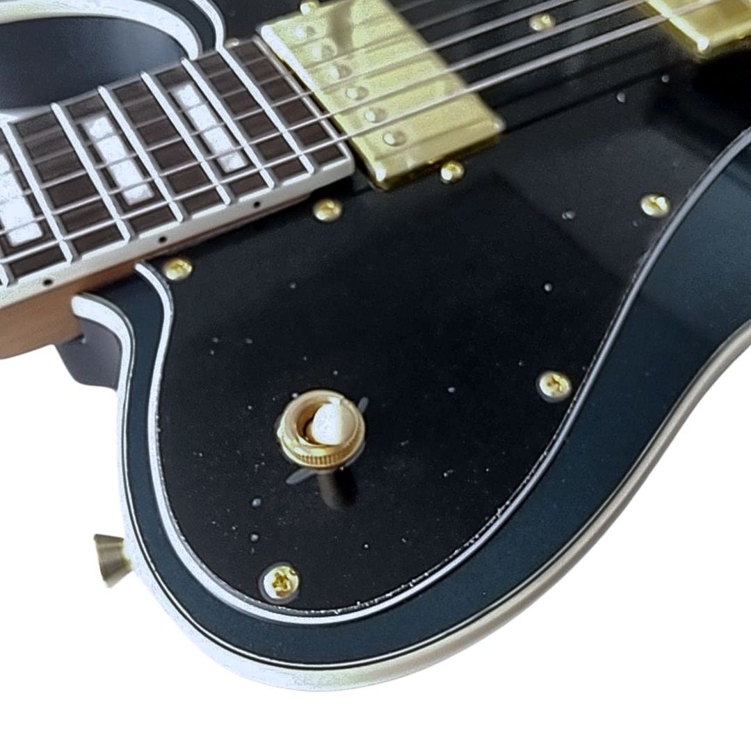 - ゴールドパーツ統一:ブリッジ、ストラップピンからヘッドロゴまで統一感のある金パーツ