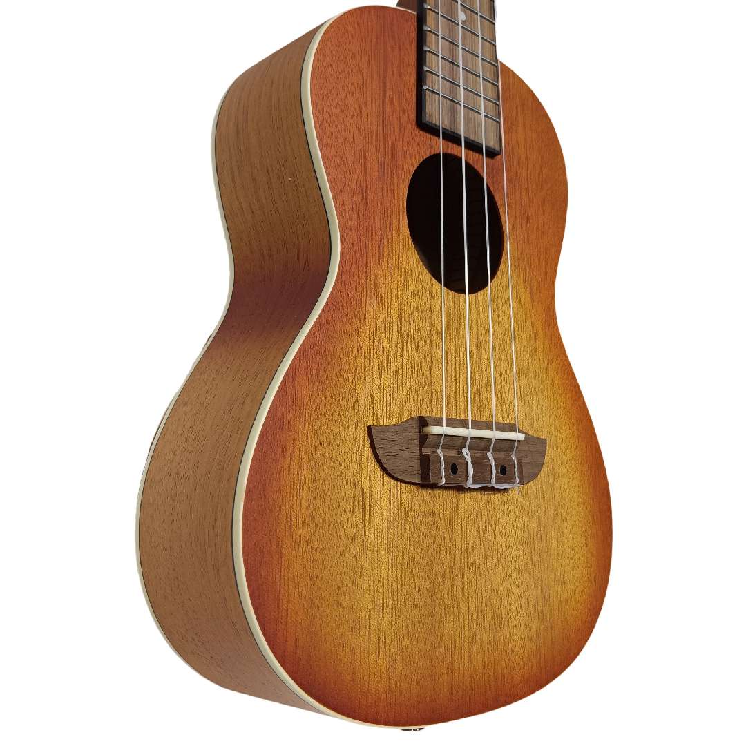 Dawn Sunburstのカラーに、トータススタイルのバインディングが映えるコンサートサイズのウクレレ。